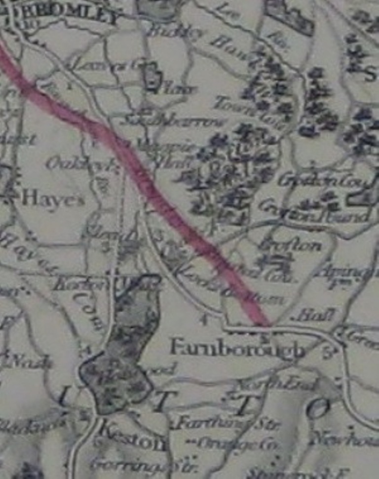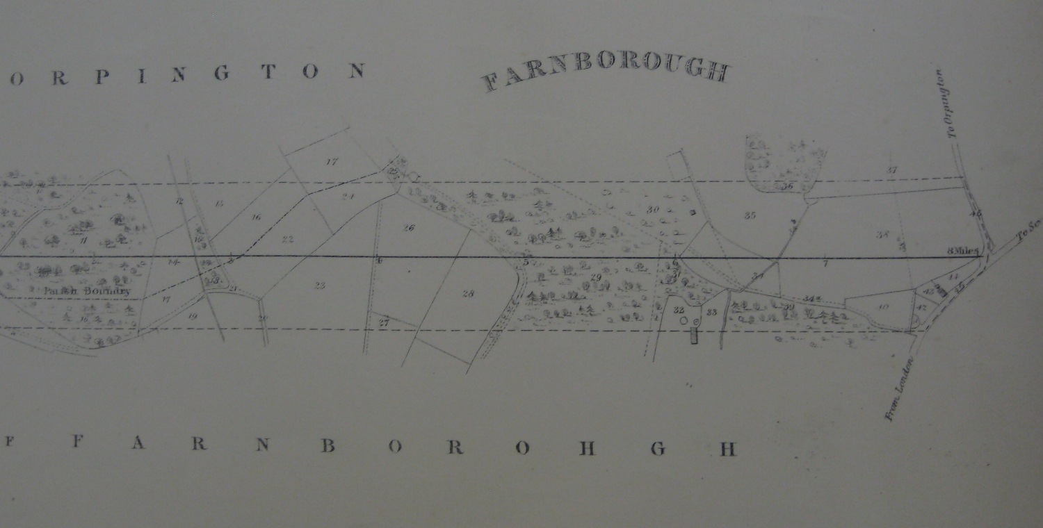 The detailed map above, also this diagram, show the planned location of the Farnborough terminus. This was proposed to be adjacent to the junction between Tubbenden Lane and the High Street. |
