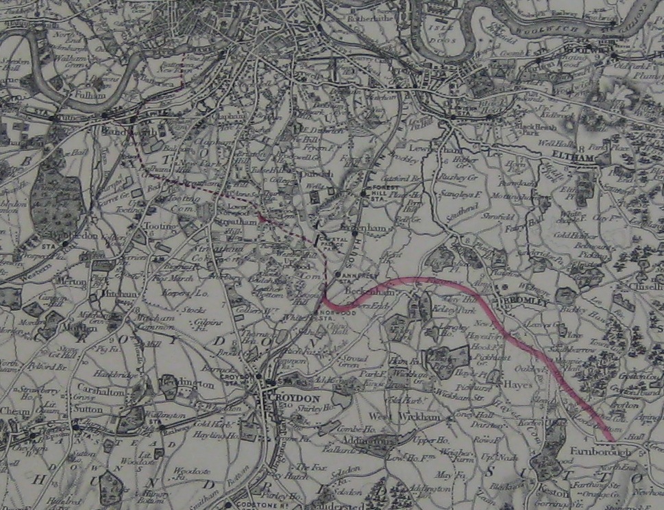 An Act of 1853 proposed continuing the line, through Beckenham and to the west of Bromley,as far as Farnborough, shown in red on this map. The map shows the proposed route from Crystal Palace via Beckenham, with also a connection to the Brighton main line from London Bridge.|