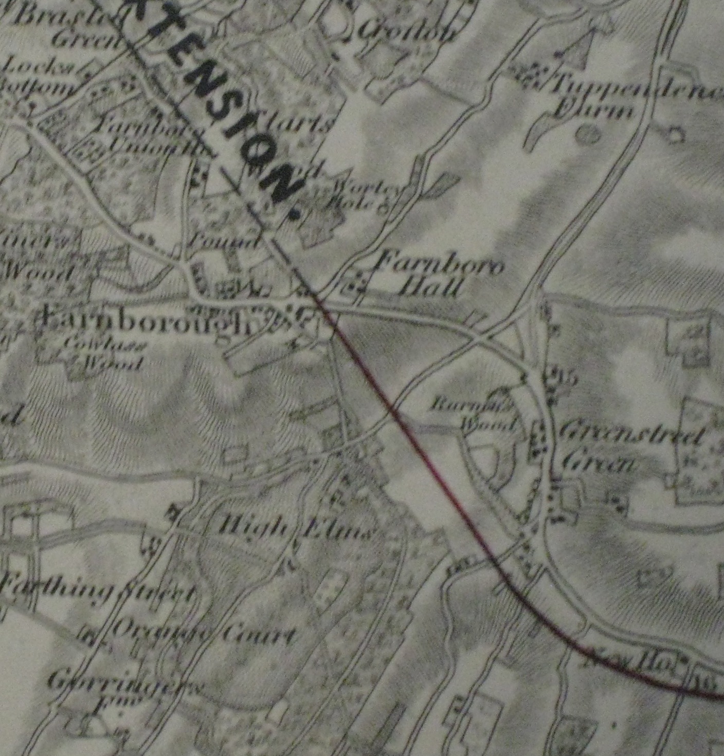 There was also a second Act, approved in 1856, authorising a further extension from Farnborough down to Ightham in Kent. The initial submission was in 1854 under the name 'London and Mid Kent', but it was then resubmitted in 1856 as an extension of the West End of London and Crystal Palace Railway'.The route is shown in the map below, with a second diagram, that shows more clearly the route to be taken through the village. The old George and Dragon Inn is clearly shown, as is a proposed minor diversion of Tubbenden Lane.
