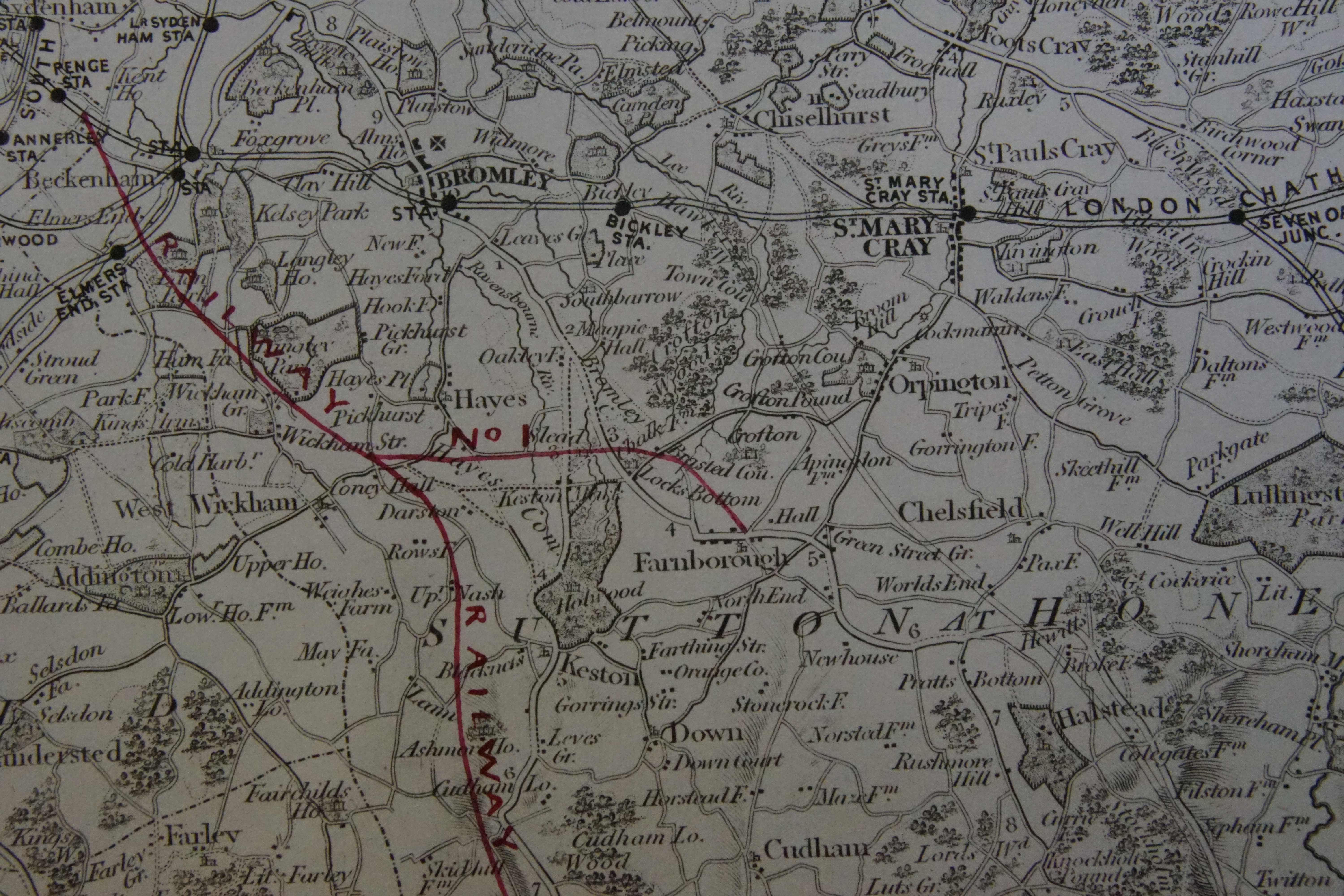 Following the completion of the new main line running through Bromley in 1862 by the London Chatham and Dover Railway, a proposal for a further line was made, again using the name West Kent Railway. The line would start at Penge with a junction with the L, C & D R and then run through West Wickham to just south of Tatsfield, from where there would be two branches, one west to Oxted, the other east to Westerham. From West Wickham, a further short branch would pass just to the south of Hayes to Locksbottom and Farnborough.