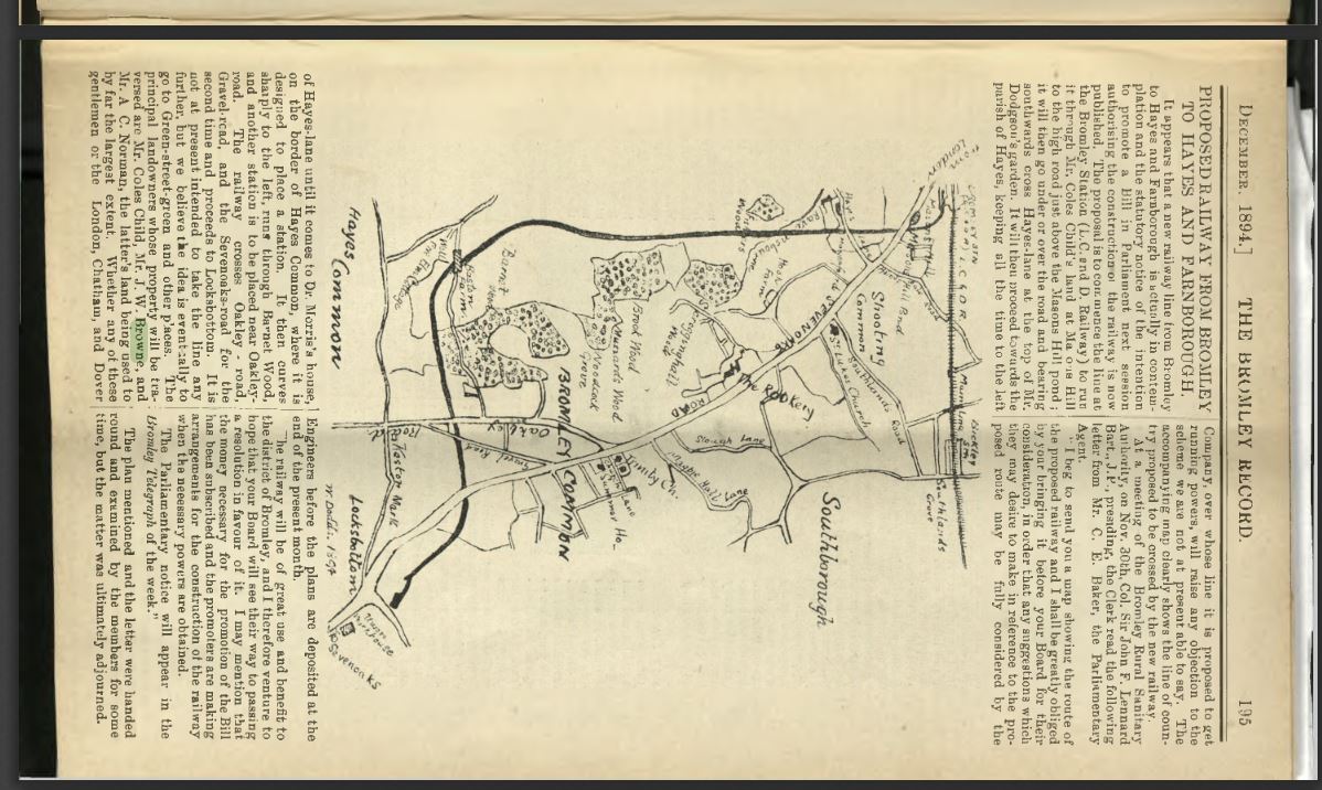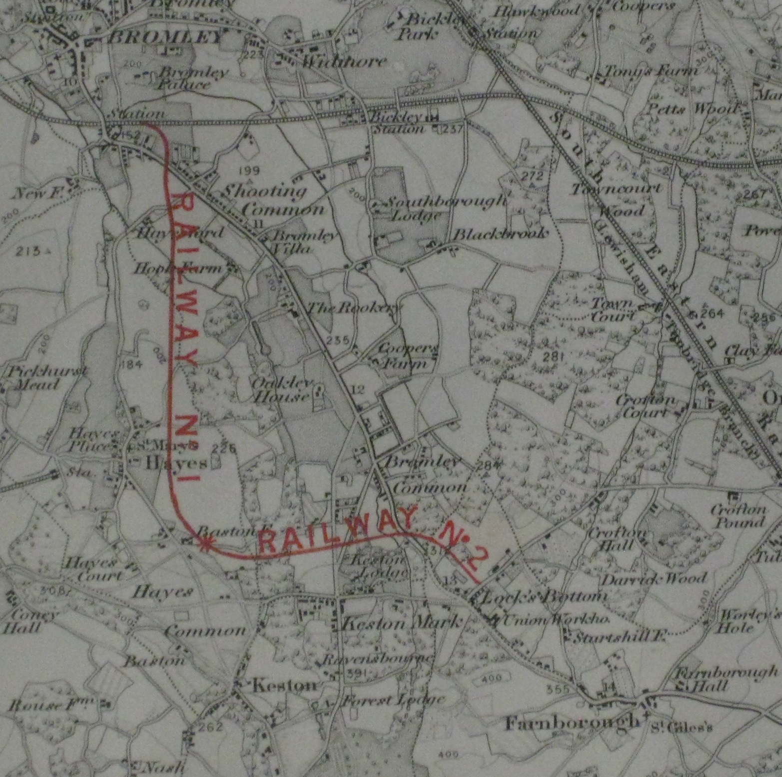 This railway would have commenced at a junction with the Up line of the then London Chatham and Dover Railway at Bromley (South) station, just east of the platforms, and then proceed about two miles to Hayes, or more specifically to a point: “in a field numbered 205 on the 1 to 2500 Ordnance Survey map of the said parish (Hayes) at a point near the fence forming the southern boundary of the said field two hundred yards or thereabouts measured in an easterly direction from the south-east corner of Baston Farm House”.