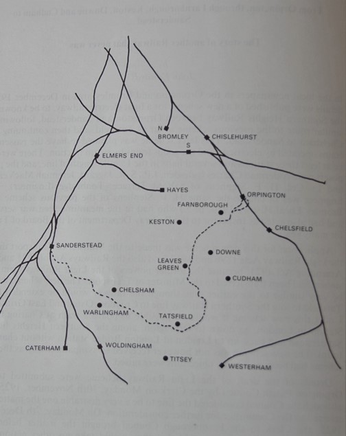 The line would commence just south of Orpington station, where there would be connections to both the up and down main lines. The two spurs would combine a short distance from the station, and from that point on the line would be single track. It would initially head south through Farnborough, Keston, Downe, Cudham and Biggin Hill to Tatsfield, then west via Titsey, Chelsham and Warlingham to Sanderstead, just south of Croydon, where it would meet the main line to London from Uckfield and East Grinstead, see map. Through services onto the main lines at both ends were envisaged, with trains able to originate from and terminate at Charing Cross and Victoria respectively. The central section being a Light Railway would be subject to a 25mph speed limit. The line would be fully electrified for use by passenger trains, while freight services would be steam-hauled..